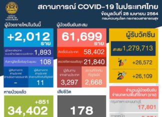Le département thaïlandais de contrôle des maladies a signalé 2 012 nouveaux cas de COVID-19 et 15 décès supplémentaires mercredi 28 avril. Le nombre...